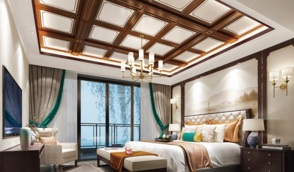 素凈通透的臥室,以大落地窗接納來自自然的悸動。頂部的大板吊頂更是加深了整個空間的視感維度,成為空間最惹眼的存在。