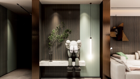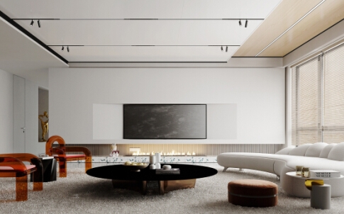 黑色波浪板在巖紋板與木紋板之間時(shí)尚過(guò)渡,這樣搭配出來(lái)的沙發(fā)背景墻,既擁有肌理的細(xì)節(jié),還給空間帶來(lái)了層次感與節(jié)奏感。