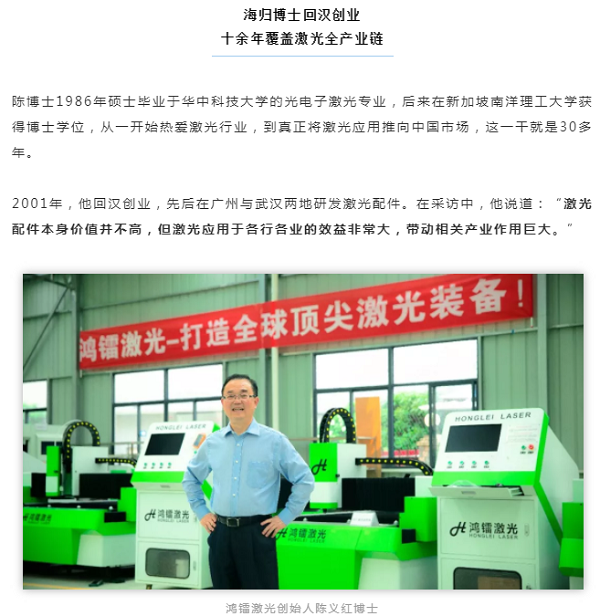 成立于2012年的武漢鴻鐳激光科技有限公司,從2015年起,連續(xù)多次入選光谷瞪羚企業(yè)。它位于武漢?中國(guó)光谷新特光電工業(yè)園內(nèi),是國(guó)家級(jí)高層次人才、新加坡海歸華僑陳義紅博士在漢創(chuàng)建的高新技術(shù)企業(yè)。