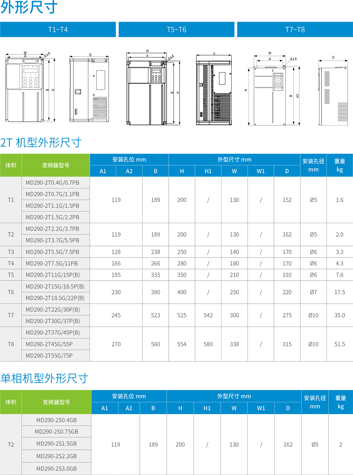 | 型號 | MD290T0.4G/ 0.7PB | MD290T0.7 G/1.1PB | MD290T1.1G/ 1.5PB | MD290T1.5G/ 2.2PB | MD290T2.2 G/3.0PB | MD290T3.0G/ 3.7PB | ||||||||
