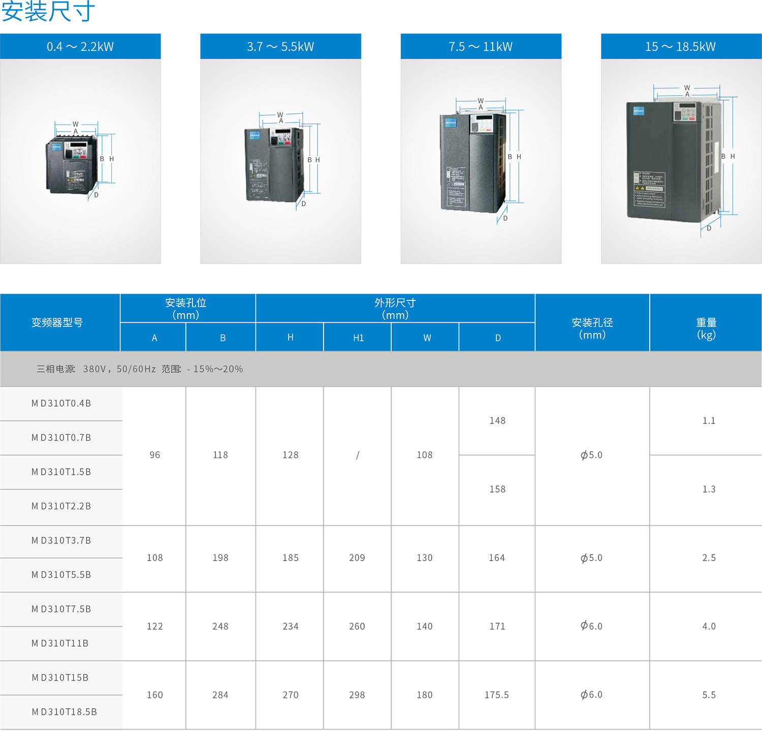 | 型號 | MD290T3.7G/ 5.5PB | MD290T5.5G/ 7.5PB | MD290T7.5G/ 11PB | MD290T11G/ 15PB | MD290T15G/ 18.5PB | ||||||