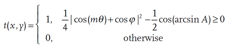 t(x, y) 的值從0到1之間連續(xù)變化,這樣的全息圖可以通過(guò)將連續(xù)值離散為多個(gè)級(jí)來(lái)實(shí)驗(yàn)實(shí)現(xiàn),從而產(chǎn)生多級(jí)振幅元素。盡管它能很好地再現(xiàn)所需的球面波,但多層掩模的制造是具有挑戰(zhàn)性的,因?yàn)樾枰_控制具有不同透射率的多個(gè)掩模的灰度。為解決這一難題,我們尋找一種編碼技術(shù)來(lái)獲得僅二進(jìn)制振幅的全息圖。我們根據(jù)與振幅相關(guān)的閾值截?cái)鄠鬏敽瘮?shù) t(x, y),然后,我們將小于和大于閾值的t(x,y)的值分別設(shè)置為0和1。以這種方式,僅二進(jìn)制振幅的全息圖可以表示為