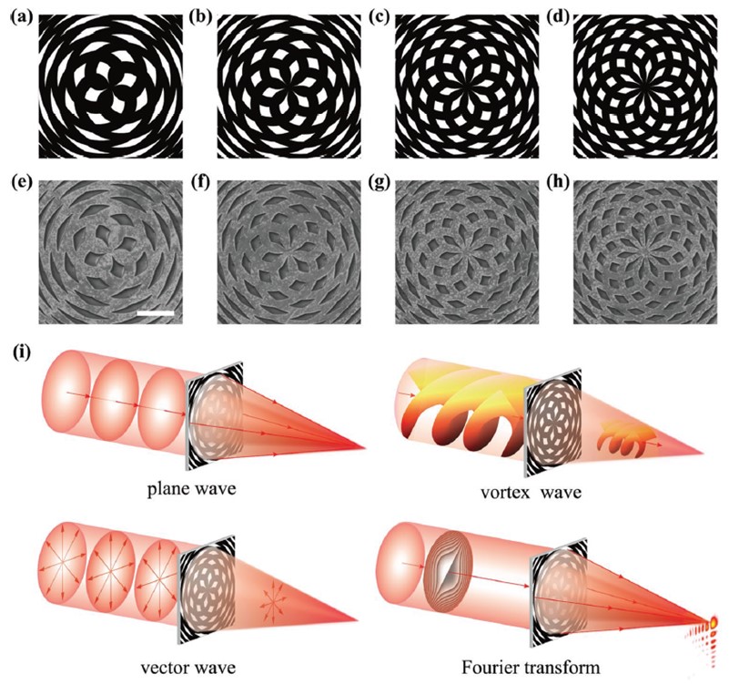 圖 1. 全局設(shè)計(jì)的平面透鏡及其在空間結(jié)構(gòu)光場(chǎng)聚焦和處理方面的潛力。其基本思想是利用角余弦波載波,將光的整體球面波陣面編碼為二進(jìn)制純振幅全息圖。(a-d)為平面透鏡的理論布局,(e-h)為相應(yīng)的實(shí)驗(yàn)布局,典型的拓?fù)潆姾蔀椋海╝,e)m = 4;(b,f)m = 6;(c,g)m = 8;(d,h)m = 10. i),當(dāng)空間結(jié)構(gòu)光束(如渦旋光束和矢量光束)照射時(shí),設(shè)計(jì)的平面透鏡有望實(shí)現(xiàn)多重聚焦性能。此外,還能實(shí)現(xiàn)更多的功能,例如對(duì)非衍射和自加速艾里光束進(jìn)行傅里葉變換。(a-h)中的面板比例相同,比例尺為10μm。