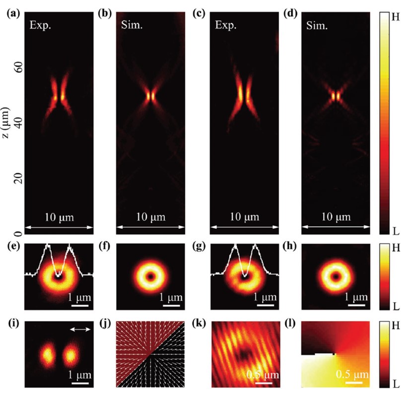 圖 3. 平面透鏡在空間結(jié)構(gòu)光光源下的亞波長(zhǎng)聚焦性能。我們考慮了兩種結(jié)構(gòu)光束,即徑向偏振矢量光束和渦流光束。如圖2所示,使用相同的平面透鏡(m=8)對(duì)聚焦性能進(jìn)行了檢驗(yàn)。(a-d) 在(a,b)矢量光束和(c,d)渦流光束情況下,沿 x - z 平面測(cè)量和模擬的衍射光場(chǎng)強(qiáng)度分布。(e,g)為實(shí)驗(yàn)結(jié)果;(f,h)為模擬結(jié)果。為了研究焦平面的光狀態(tài),(i) 和 (k) 分別顯示了實(shí)驗(yàn)矢量場(chǎng)的 x 分量和渦旋場(chǎng)的平面波干涉條紋;(j) 和 (l) 則分別顯示了矢量光束和渦旋光束在焦平面的偏振和相位分布。