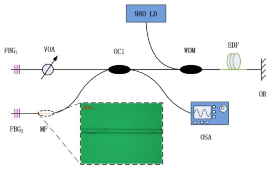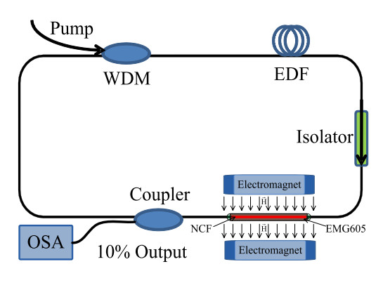 如下圖所示是用于磁場檢測的基于磁流體的光纖環(huán)形激光傳感器,在激光環(huán)型腔中接入涂覆有磁流體的單模-無芯-單模光纖結(jié)構(gòu),可以同時(shí)作為帶通濾波器和磁場傳感元件?;谧杂诚裥?yīng),外界磁場改變時(shí)會(huì)通過作用于磁流體從而改變單模-無芯-單模光纖結(jié)構(gòu)的濾波參數(shù)即輸出光譜波長,得到的帶通濾波邊模抑制比為14 dB,插入損耗約為-1.03 dB。當(dāng)外界磁場增大時(shí),激光波長藍(lán)移。在15.9 Oe到222.3 Oe的磁場范圍內(nèi)傳感靈敏度為12.05 pm/Oe。該傳感器具有高信噪比的輸出光譜、窄帶寬和高Q值等優(yōu)點(diǎn)。
