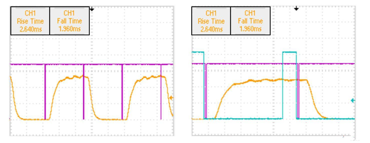 在1064 nm處,液晶從10%到90%范圍內(nèi)上升和下降時(shí)間小于3 ms。將焦點(diǎn)通過觸發(fā)打開和觸發(fā)關(guān)閉進(jìn)行檢測(cè)。 (左)由軟件定時(shí)驅(qū)動(dòng)的液晶開關(guān)。 焦點(diǎn)被打開和關(guān)閉探測(cè)器(顯示為黃色)。 當(dāng)SLM上的圖像發(fā)生變化時(shí),硬件會(huì)產(chǎn)生一個(gè)輸出脈沖(以紫色顯示),表示新圖像將在1.18 ms內(nèi)開始在SLM上加載。 (右)由外部硬件觸發(fā)驅(qū)動(dòng)的液晶開關(guān)。 當(dāng)外部觸發(fā)器的下降沿到達(dá)(以藍(lán)色顯示)時(shí),硬件將啟動(dòng)SLM上的圖像更新。 產(chǎn)生輸出脈沖以確認(rèn)接收到觸發(fā)(以紫色顯示)。 在產(chǎn)生輸出脈沖后的1.18面試內(nèi),圖像將在SLM上更新(以黃色顯示,焦點(diǎn)移入和移出檢測(cè)器)。
